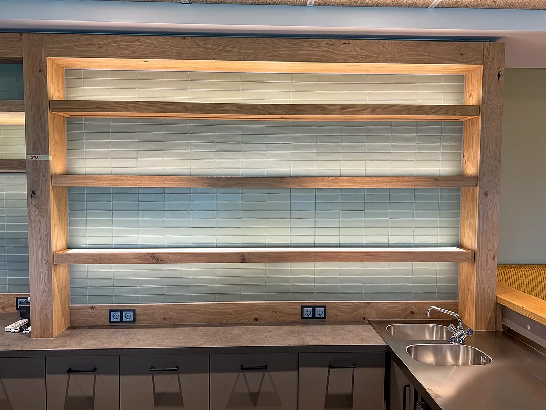 - Buffetbereich mit Kühlplatte und Kühlwanne, Wandregal und Schränken